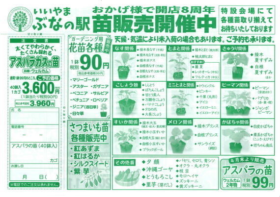 苗の販売も始めます! ぶなの駅で取り扱う苗は、丈夫で育ちが良いと毎年大好評です。